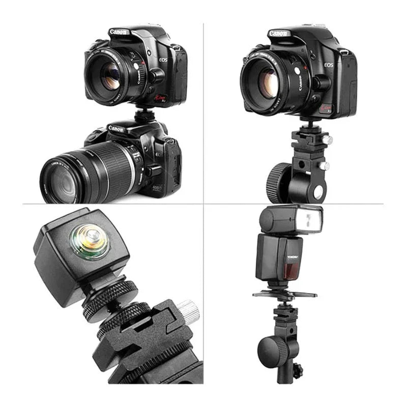 Adaptern monteras i blixtskon / Cold Shoe och på den sitter en skruv med 1/4" standardgänga och två låsringar.