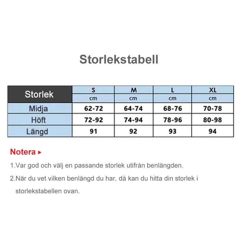 - XL: Midja 90-100 cm, Höft 115-125 cm