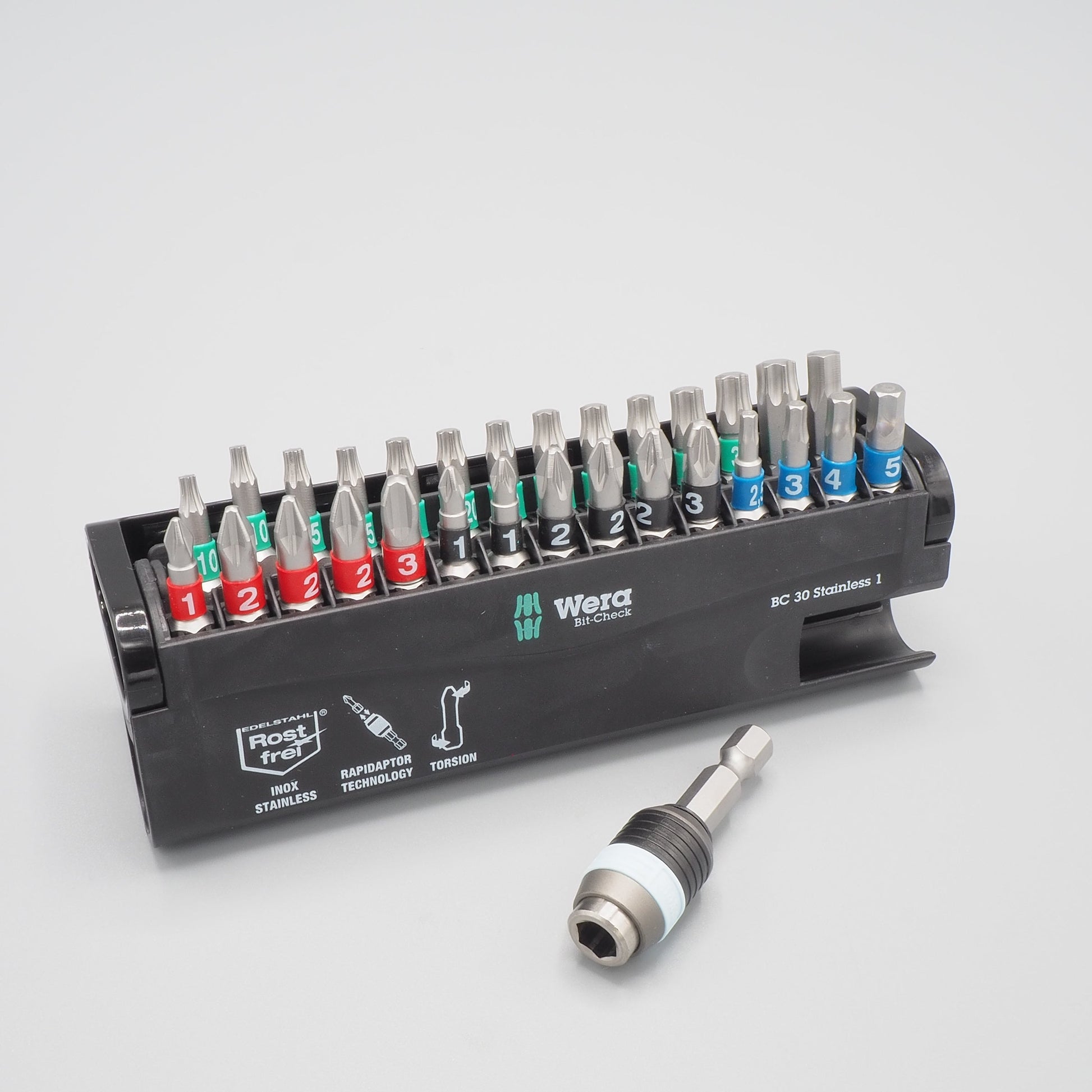 Den medföljande Rapidaptor-bithållaren med snabbchuck möjliggör snabba bitbyten utan verktyg, med stark magnet och låsning. Perfekt för skruvdragare och borrmaskin i industri, VVS, livsmedelsmiljöer och andra områden där korrosionskontroll är kritisk.