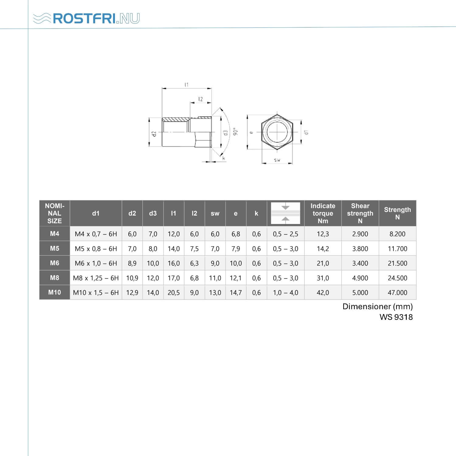 Behöver du skapa en stark och permanent gänga i tunnväggiga material? Blindnitmutter WS 9318 i rostfritt stål A2 (AISI 304) är lösningen där vanlig gängning inte är möjlig. Det lilla försänkta huvudet gör att muttern kan monteras plant i materialet, samtidigt som det halvsexkantiga skaftet förhindrar att den roterar vid montering och användning.