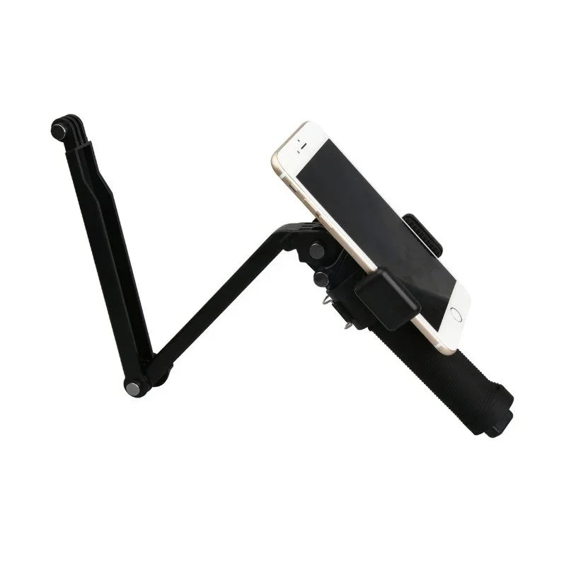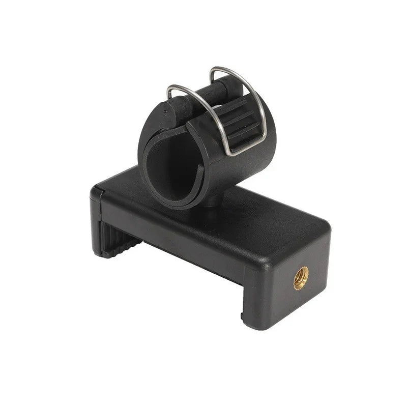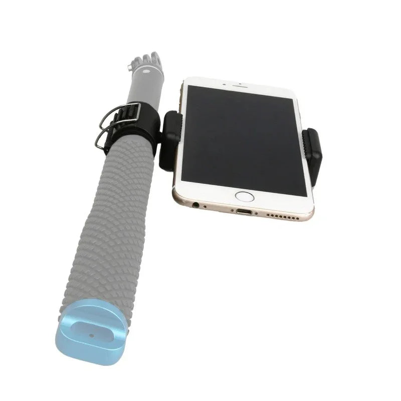 Själva mobilhållaren har ett fjädrande, gummerat gap och kan hålla mobiler som är mellan 6,7cm - 9cm breda (de flesta smartphones). På hållaren sitter 2st 1/4" skruvfästen, ett på baksidan och ett på ena kortsidan. Med hållaren följer ett fäste med en 1/4" skruv att skruva in på valfri plats i hållaren. Detta fäste kan du sedan snäppa fast runt din selfiepinne med ett fjädrande snäpplås. Fästet klarar av selfiepinnar med diameter mellan 2,6-3cm