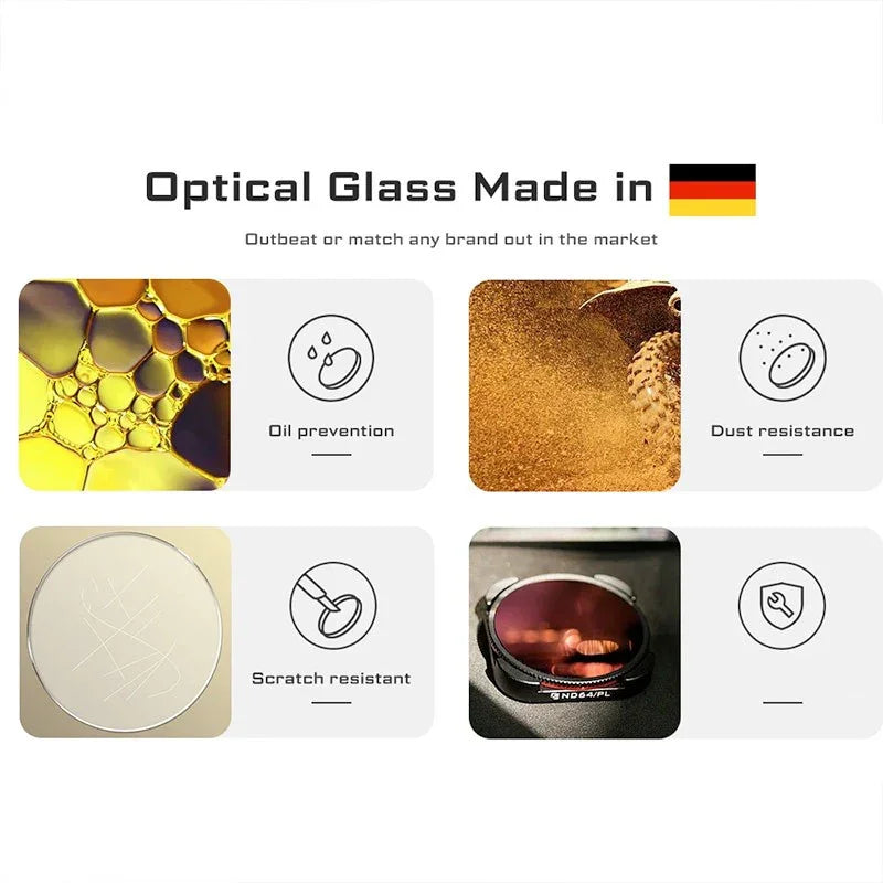 Filtren är konstruerade av optiskt kvalitetsglas med en aluminiumram för absolut bästa bildåtergivning och hållbarhet.