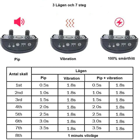 - Vibrationsläge: Halsbandet vibrerar i 1.8 sekunder vid varje skall.