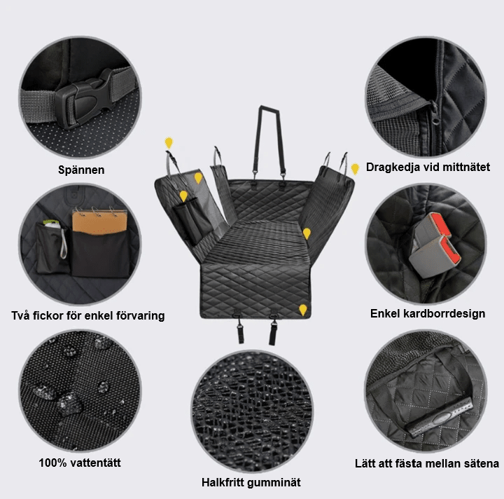Hundkojan är en pålitlig skyddsbarriär för hela ditt baksäte, inklusive dörrsidor, som skyddar mot klorna, fläckarna, vätskorna, lukterna, håret, leran och allt annat som din hund kan föra in i bilen.
