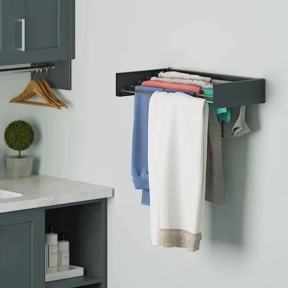Slipp stora torkställ som tar upp onödig plats. Den infällbara tvätthängaren monteras på väggen och fälls enkelt ut när du behöver extra torkyta. En praktisk och stilren lösning för dig som vill använda hemmets ytor mer effektivt.