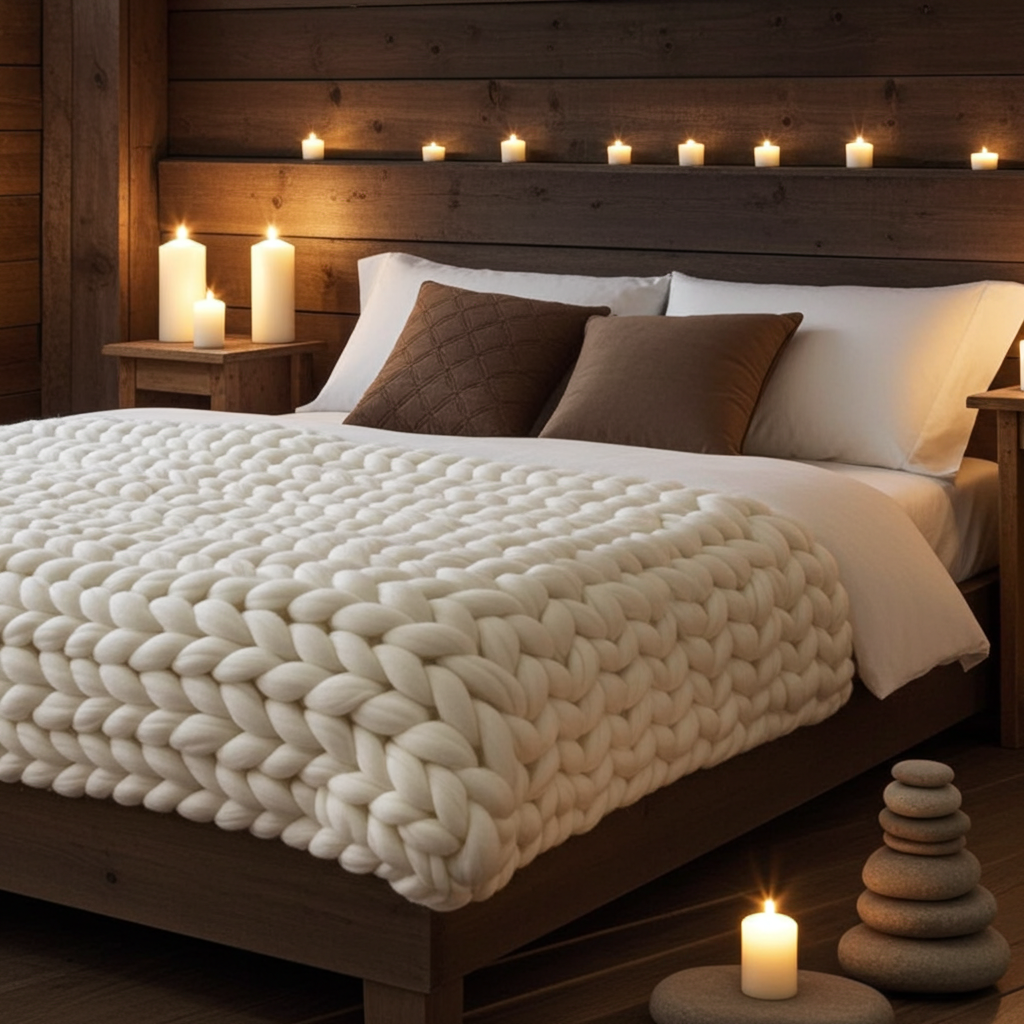 Riktigt tjock filt i ett material som känns tungt och värmer skönt en kall dag. Fungerar även bra som tyngdtäcke.