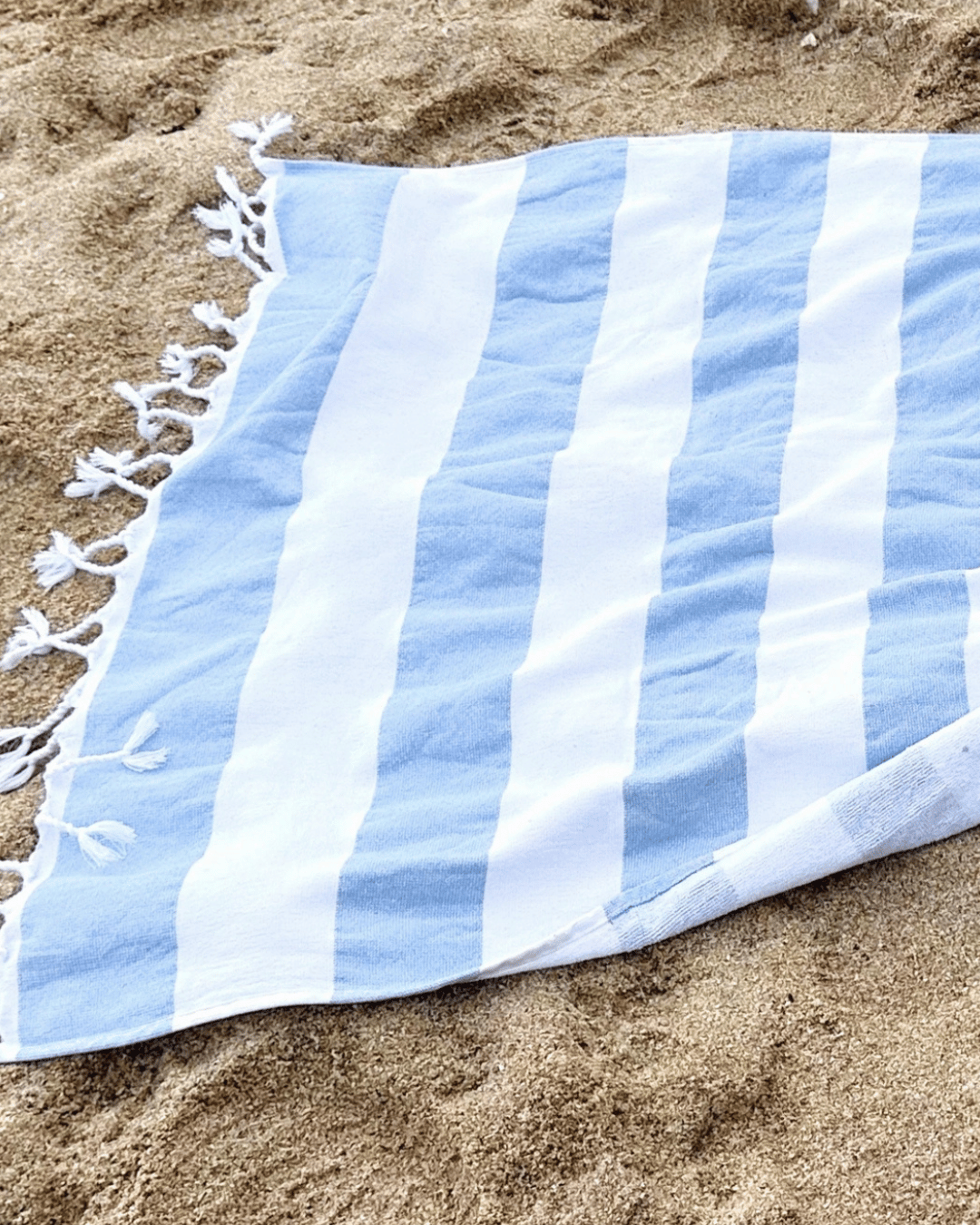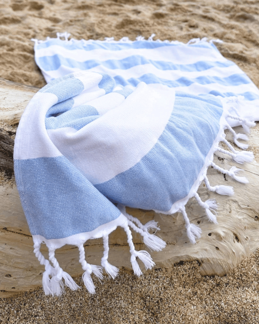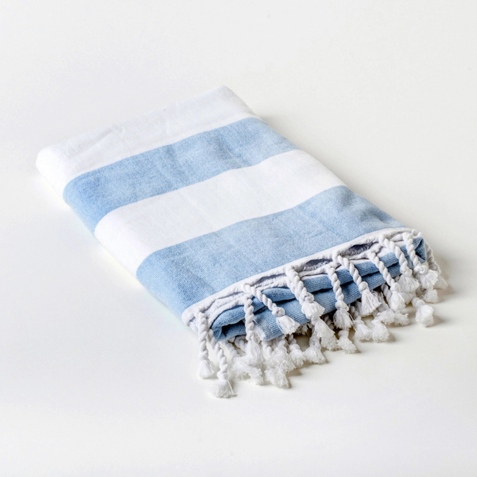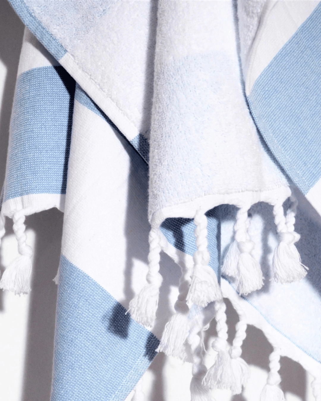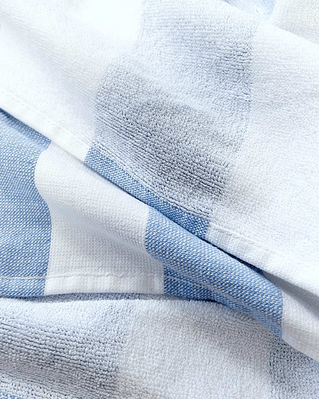 Upptäck Lagoon badlakan i randig frottékvalite med varannan rand i frotté, varann i tunnvävd hamam kvalite. Perfekt för dig som söker en frottéhandduk som väger mindre, torkar snabbare och tar ihopvikt mindre plats.