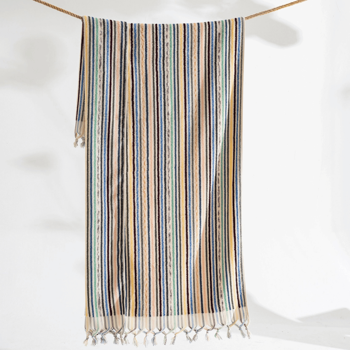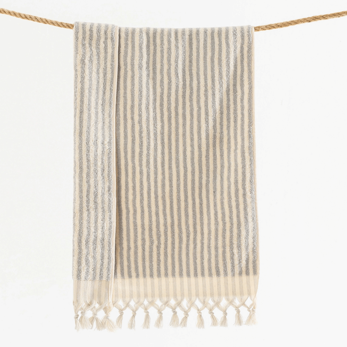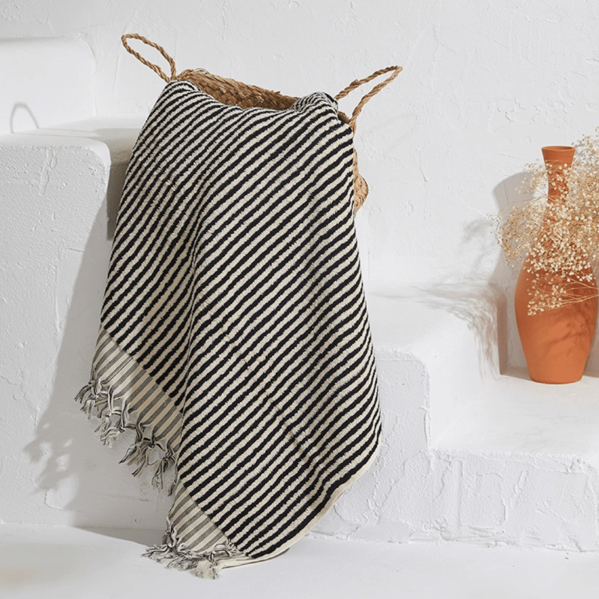 Frottékvaliteten gör handduken extra slitstark och superabsorberande, samtidigt som den förblir elegant och tidlös med sina klassiska randiga mönster. Varje handduk är omsorgsfullt handvävd för att kombinera traditionellt hantverk med modern stil.