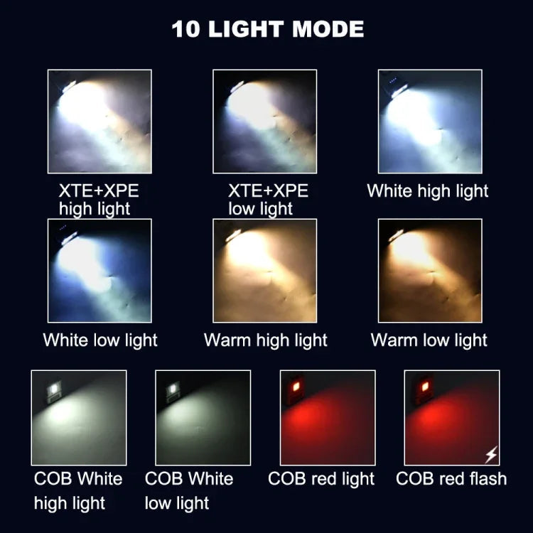 Lampan erbjuder flera ljuslägen genom huvudbelysning, sidoljus och färgade LED-dioder. Du kan växla mellan vitt och varmt ljus beroende på önskad synlighet och komfort. Sidoljuset har även rött och blinkande läge som fungerar som varningssignal vid nödsituationer. Detta gör arbetslampan lämplig vid vandring, bilproblem vid vägkanten eller som nödbelysning i strömlösa miljöer.