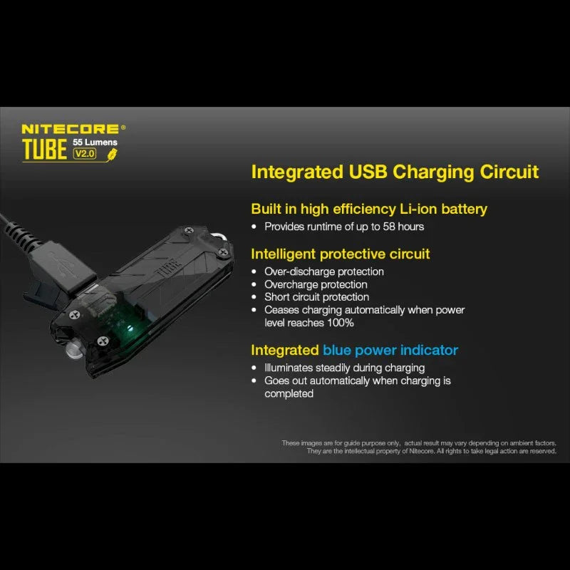 Nitecore TUBE V2.0 är utrustad med ett inbyggt Li-ion-batteri som laddas direkt via Micro-USB-porten. Du behöver inga separata laddare eller batteribyten – anslut bara till en dator, powerbank eller USB-laddare.