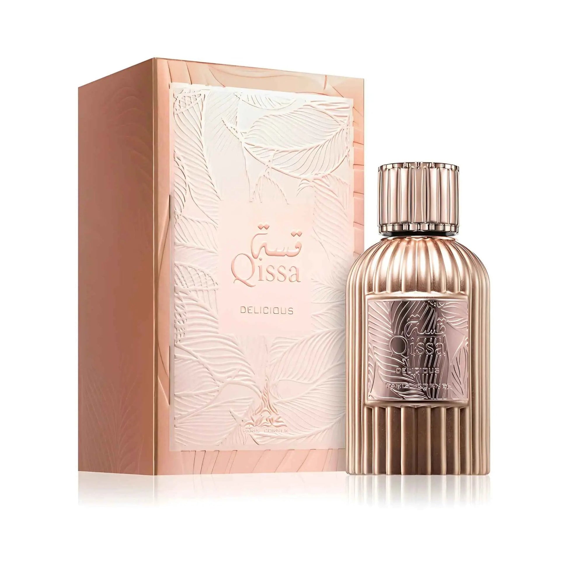 Qissa Delicious är en söt och fruktig gourmanddoft som kombinerar ljuvliga fruktiga och blommiga noter med en varm bas av vanilj och musk. Den öppnar med en uppfriskande blandning av fruktiga toppnoter, följt av ett mjukt och blommigt hjärta som tillför en feminin och elegant känsla. Basen är söt och mjuk med vanilj, vilket ger en långvarig, varm och förförisk avslutning. Doften är perfekt för den som älskar söta och läckra dofter som är både inbjudande och sofistikerade.