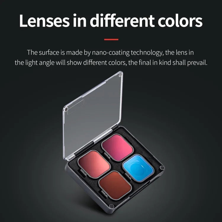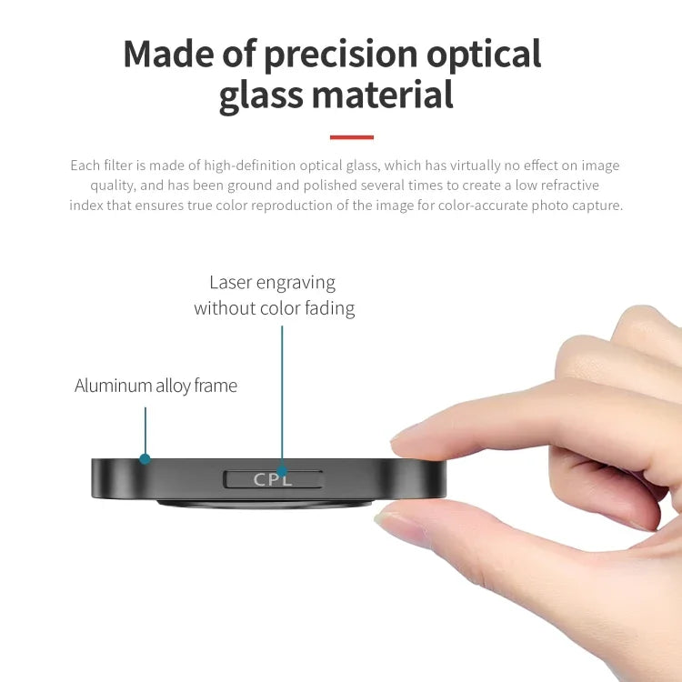 2. Each filter is made of high-definition optical glass, which has no effect on image quality. After multiple grinding and polishing, it forms a low refractive index to ensure the restoration of the true color of the image, so as to achieve color-accurate photo shooting.