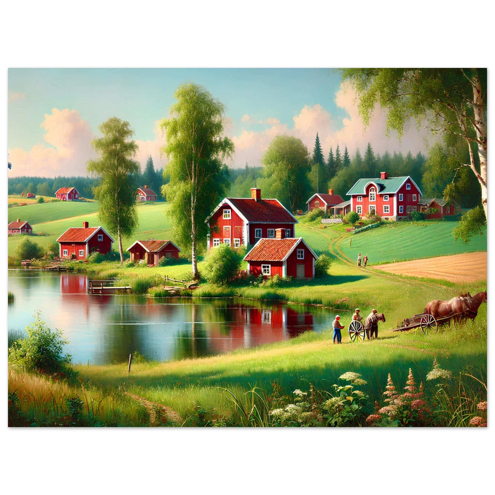 Ge ditt hem en touch av svensk natur med denna vackra poster som fångar den idylliska landsbygden. Denna landskapsposter visar de rullande gröna fälten, traditionella röda stugorna med vita knutar och en lugn, spegelblank sjö. Omgiven av björkar och vildblommor skapar postern en harmonisk och fridfull atmosfär – perfekt för dig som älskar naturens skönhet.
