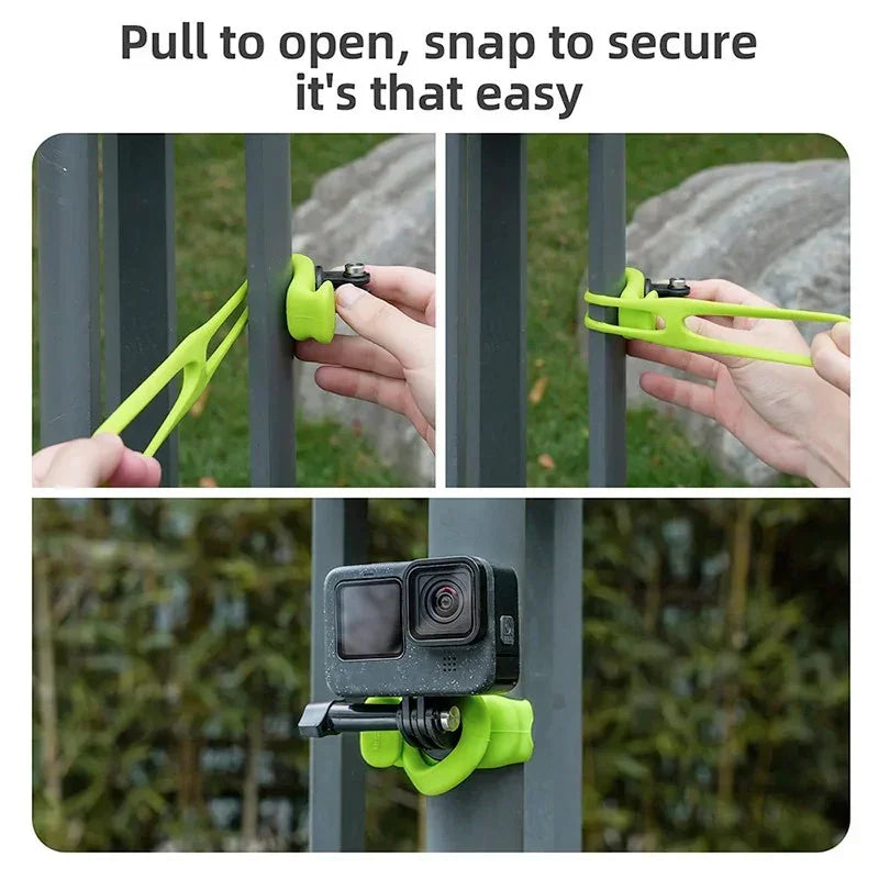 Silikonbandet träs runt objektet du vill montera fästet på och bandets 2 hål träs runt den "hake" som finns på fästet (och eventuellt själva kamerafästet i sig för extra säkerhet).