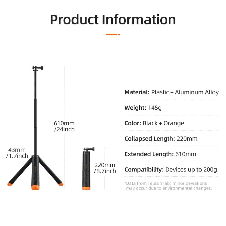 Telesin Flytande Selfiepinne Tripod 220 - 610mm med fäste för GoPro