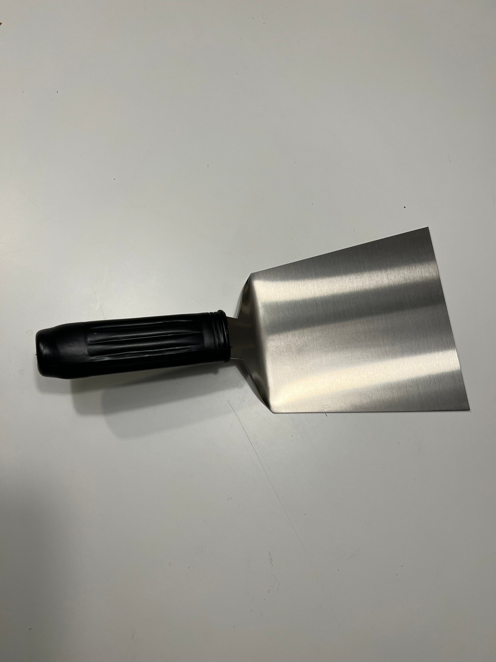 Nu är ingår även en stor Stekspade/skrapa i rostfritt stål som är det perfekta komplementet och gör det enkelt att flippa burgare och kött med samt att enkelt kunna skrapa av rester från bordet under och efter användning. Med 15cm bred kan man flippa stora burgare och köttbitar.